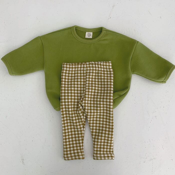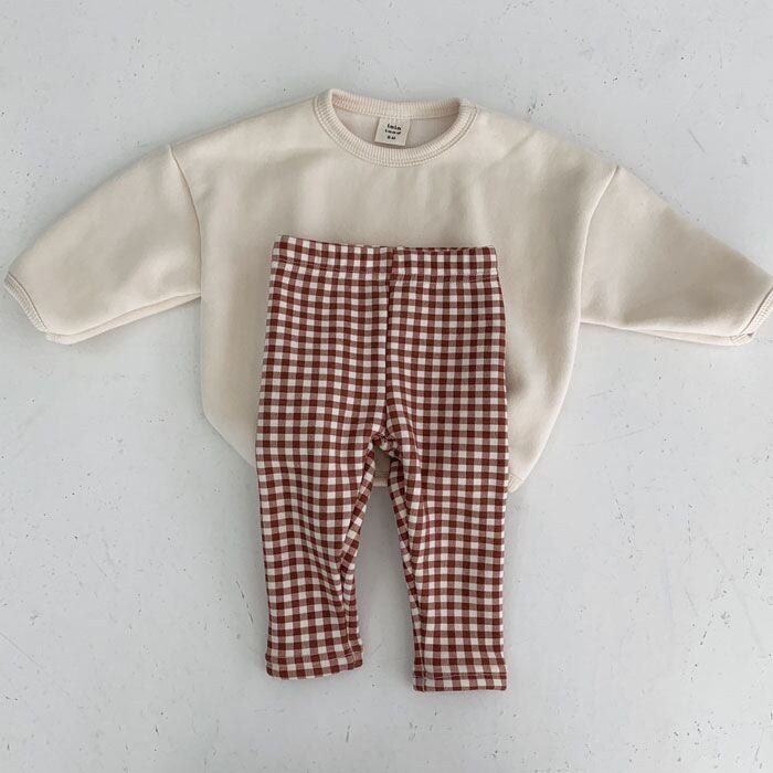 三色トップスとチェック柄パンツの上下セットの登場です。
