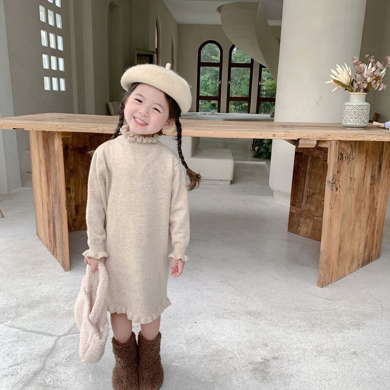 韓国子供服 女の子 ニットワンピース 無地 裾・襟プリーツ ワンピース