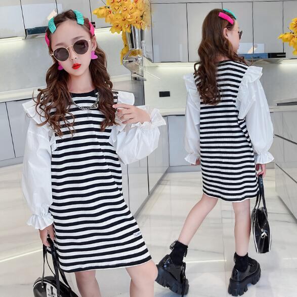 ワンピース ストライプ 韓国子供服 パフスリーブ 長袖 ボーダー柄
